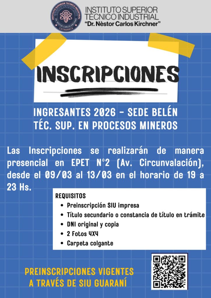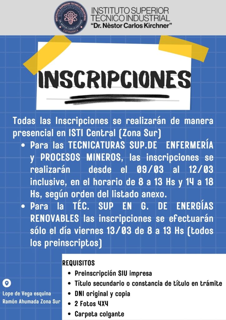 Para inscribirte, debes figurar en el listado y dirigirte, en el día que te toca en el listado, a la sede del ISTI sede Central en zona sur en los horarios de 08:00 a 13:00 hs. por la mañana y de 14:00 a 18:00 hs. por la tarde.